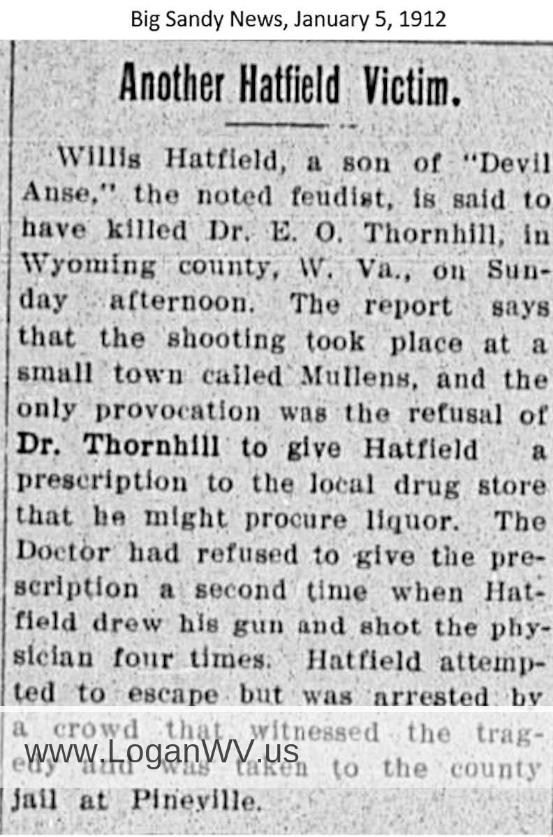 The second son, Valentine, later became known as “Wall” Hatfield, who settled on Tug River at the present site of Sprigg in the County of Mingo. “Uncle Walley,” as he was known in later years, reared his family of twelve children, among whom was the second Ephraim. “Big Eaph,” as he was called, was born in 1811 and settled on Mate Creek. He became a mighty hunter and once killed a panther with a hunting knife on a rocky hilltop at the head of Mud Lick Branch near Red Jacket.