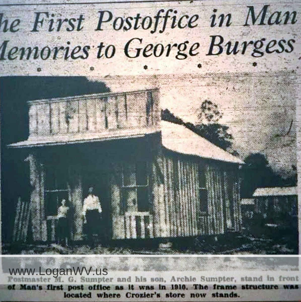Logan Banner clipping showing 1910 picture of the first Post Office at Man, WV. Courtesy of Paula Solar. Image 2584.