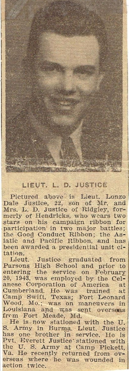 Lonzo was raised just north of Dry Fork, on the county line. His parents were Lorenzo and Rosetta Justice. The house was adjacent to the swing bridge over the Cheat River, north of Dry Fork. Clipping courtesy of Jan Justice.