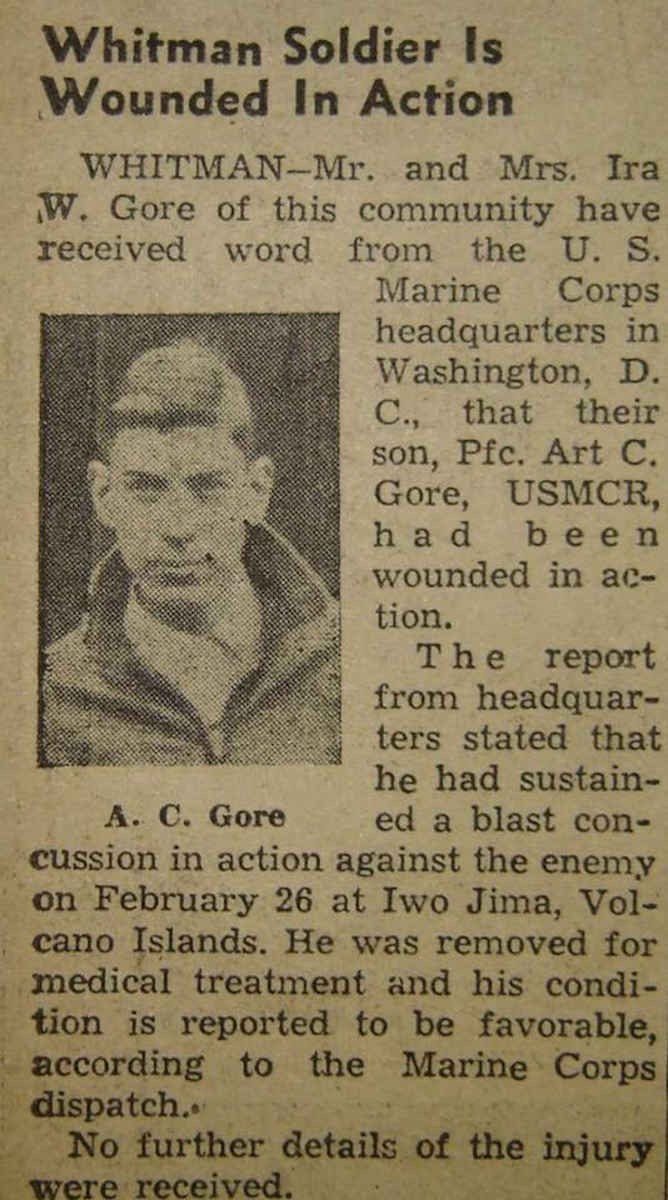 PFC Art C. Gore wounded on Iwo Jima. Clipping courtesy of Bobbie Henthorn Spiers