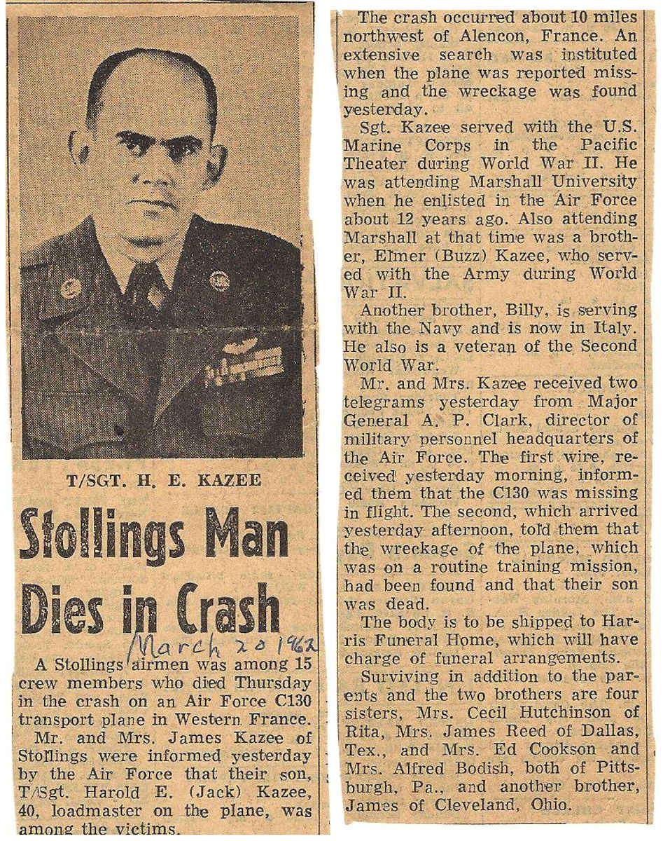T/Sgt. H. E. Kazee from Stollings killed March 8, 1962 in France. Obit clipping courtesy of his niece, Jane Kelly.